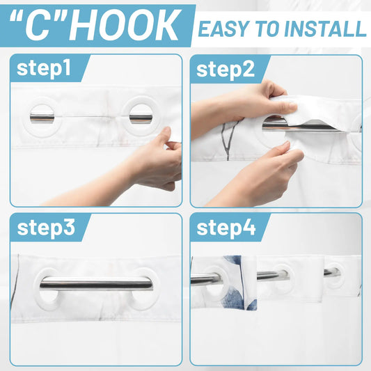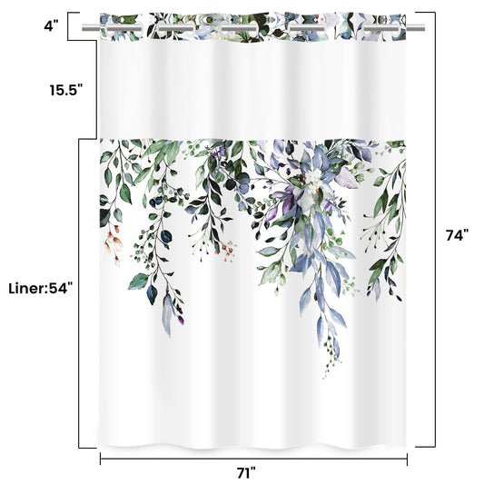 WITHLOC No Hook Shower Curtain with Snap in Liner - Fabric Waterproof Inner Liner, Plants Blue Beige Flowers White Cloth Shower Curtains Washable, 71 x 74 Inch / 71 x 86 Inch - Watercolor Floral Shower Curtain