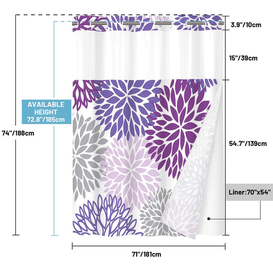 WITHLOC No Hook Shower Curtain with Snap in Liner - Dahlia Floral Shower Curtain - Fabric Waterproof Inner Liner, Plants Purple Grey Flowers Modern Cloth Shower Curtains - Machine Washable, 71 x 74