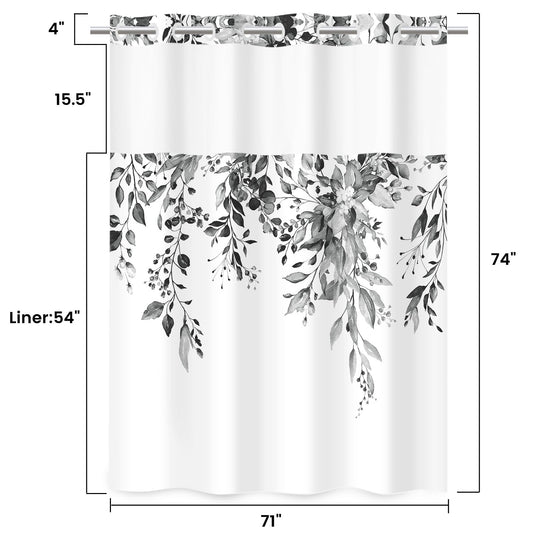 WITHLOC No Hook Shower Curtain with Snap in Liner - Eucalyptus Shower Curtain - Fabric Waterproof Inner Liner, Plants Black Leaves Modern Shower Curtains - Machine Washable, 71 x 74