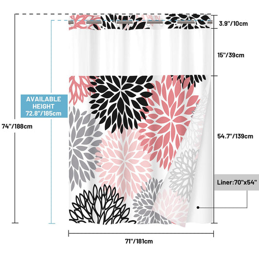 WITHLOC No Hook Shower Curtain with Snap in Liner - Dahlia Floral Shower Curtain - Fabric Waterproof Inner Liner, Plants Pink Grey Flowers Modern Cloth Shower Curtains - Machine Washable, 71 x 74