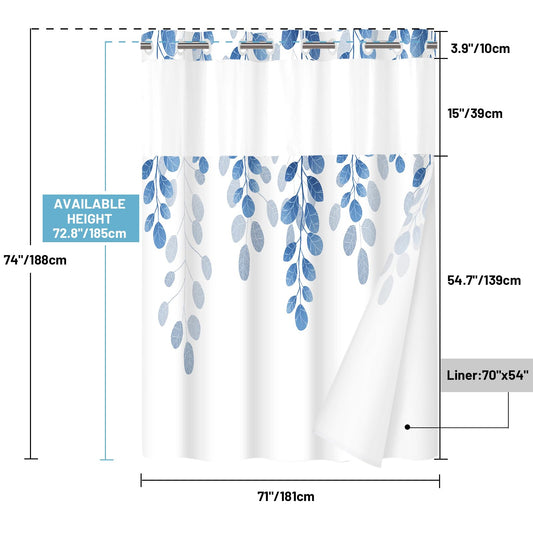 WITHLOC No Hook Shower Curtain with Snap in Liner - Eucalyptus Shower Curtain - Fabric Waterproof Inner Liner, Plants Blue Leaves Modern Shower Curtains - Machine Washable, 71 x 74